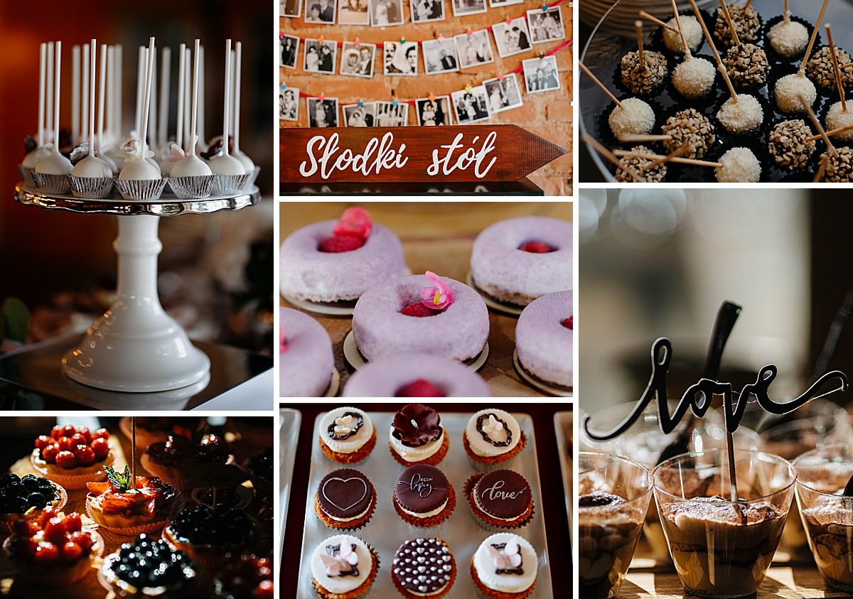 7. Candy bar – czyli słodki stół to prawdziwy zakątek słodkości, w którym nie brakuje pięknie wyglądających łakoci. Cake popsy, mini deserki, pralinki, babeczki, makaroniki, lizaki i ciasteczka – jest w czym wybierać. Nie dość, że cieszą podniebienie, to wyjątkowo pięknie wyglądają. Nic więc dziwnego, że słodki stół stanowi niejako uzupełnienie dekoracji sali weselnej. Dodatkowy powód, by go mieć!
