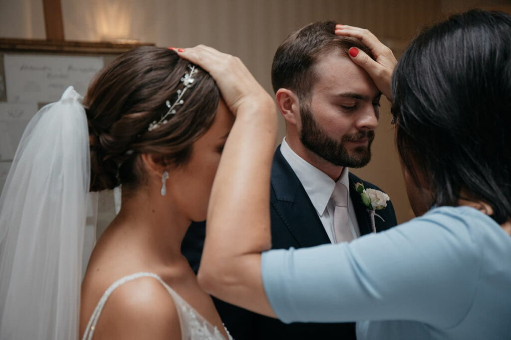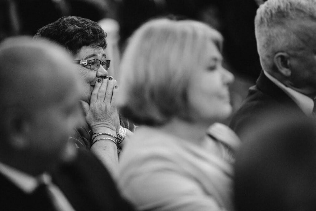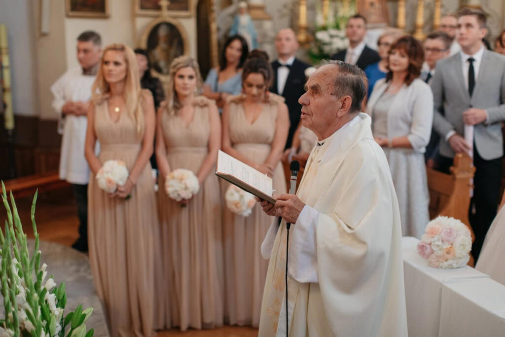 Spodziewaliśmy się, że na czas ceremonii ślubnej , energia i fanfary nieco ustąpią miejsca powadze i zadumie. Nic bardziej mylnego! A wszystko za sprawą nikogo innego a księdza, który udzielał ślubu Oli i Przemkowi. Okazało się, że tego dnia był wyjątkowo w zastępstwie. A był to ksiądz, który śmiało możemy powiedzieć, porwał cały kościół. Poprowadził ceremonię z energią, zaangażowaniem, radością, nie szczędził żartów a nawet zaśpiewał parze młodej piosenkę. Niemal wszystkim uśmiech nie schodził z twarzy. To niezwykłe uczucie uświadomić sobie, jak szczęśliwych będą siebie samych oglądać na ślubnych fotografiach za kilkanaście a może i nawet kilkadziesiąt lat!