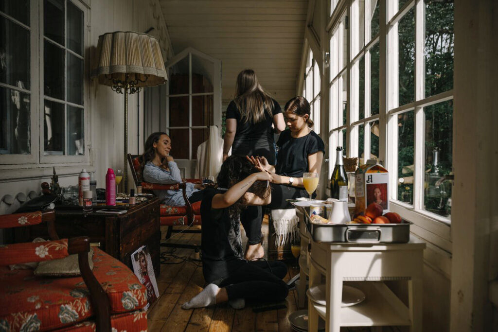 Wróćmy do Estery i Kristoffera. Już sam początek tego dnia był szczególny. Przygotowania panny młodej odbyły się w typowo skandynawskiej willi, z pięknym ogrodem nad brzegiem zatoki w Oslo. Równocześnie z powstawaniem makijaży i fryzur panny młodej i druhen, przygotowania trwały również na zewnątrz, w ogrodzie. Grono najbliższych przyjaciół i liczna rodzina obecna była od wczesnych godzin porannych. Wspólne rozstawianie namiotów na wesele, dekoracji, oświetlenia, wyznaczanie miejsca ceremonii, a wszystko to w towarzystwie biegających dzieciaków, zabawy i luzu. Przygotowania Kristoffera odbyły się w domu, z prawdziwie królewskim śniadaniem. Bliscy zadbali o każdy szczegół, by umilić ten dzień nowożeńcom.